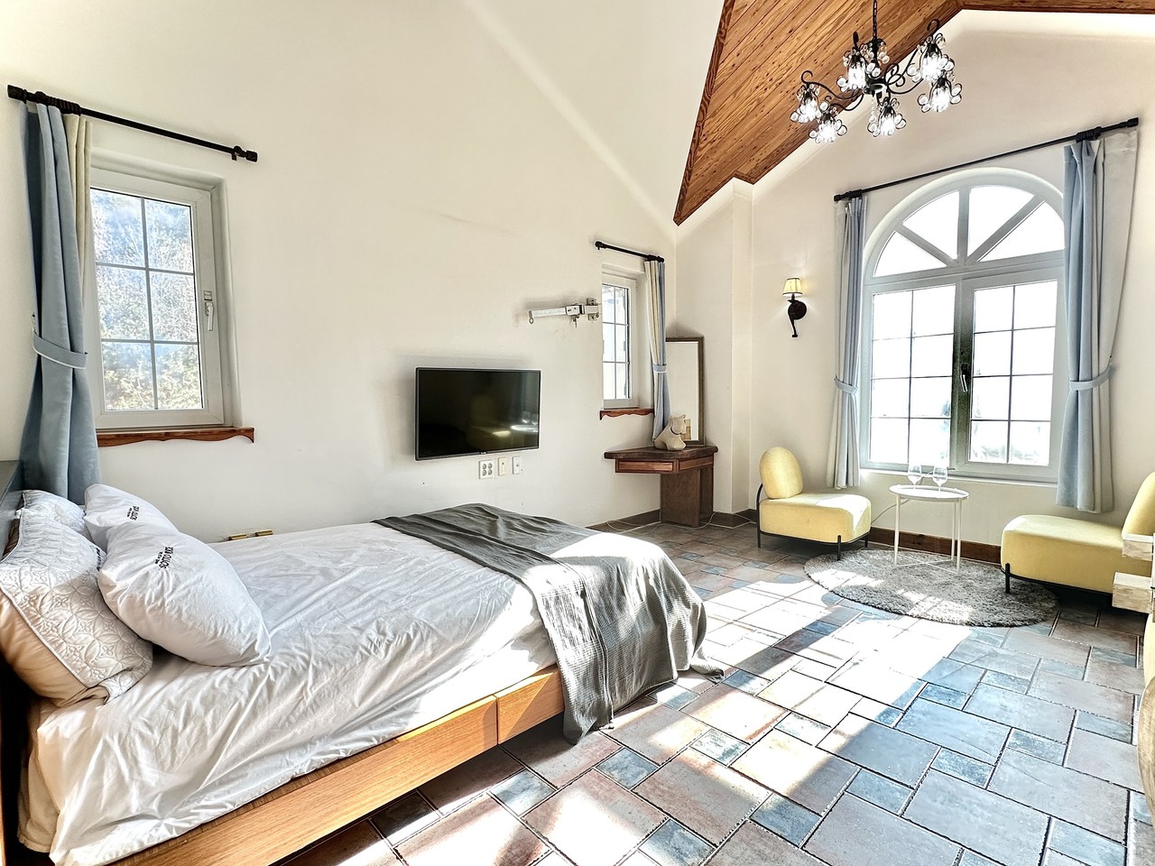 원룸형 : 거실, 주방, 화장실1, 침대(퀸)1개, 기본 구성, (2인 초과시 온돌 침구 제공)